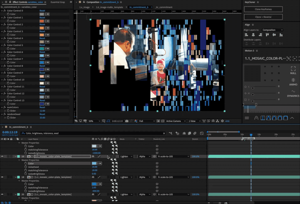 Using After Effects expressions and essential properties, we created templates that respond dynamically to the colors of a sampled image. In this example, content authors can select a set of colors from NAB’s brand palette, and color bars will appear at whatever spots those colors can be found in the image. This creates a cohesive composition that amplifies the colors of any image you drop into the template.