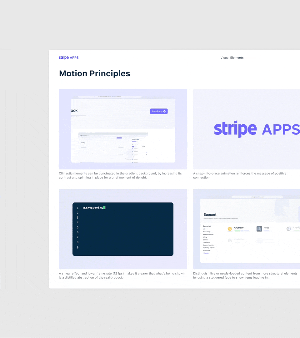 As the project progressed, we began to distill a set of global motion principles for Stripe product demos, building upon existing brand motion language. It was an organic project offshoot that would help inspire broader conversations about how the brand comes to life in motion.